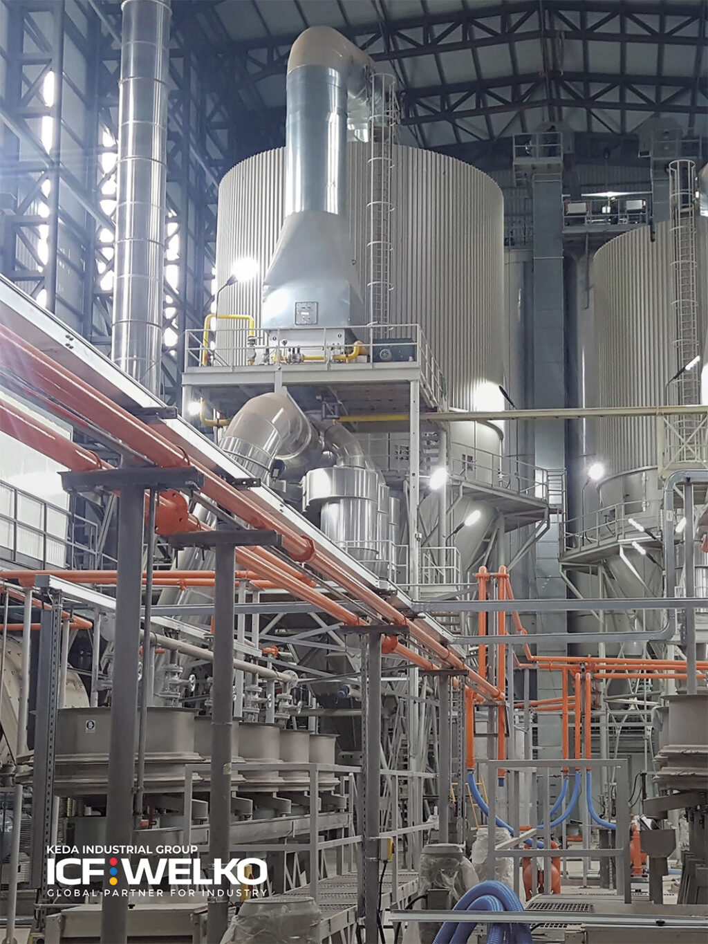 La fornitura consiste in due atomizzatori, uno con capacità evaporativa di 9.600 litri/ora e il secondo di 4.800 litri/ora, l’automazione per la colorazione della barbottina, lo stoccaggio e la gestione delle polveri, due presse da 5.200 tonnellate, macchine di carico e scarico e attrezzatura da laboratorio.